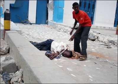 | A Somali boy looks away as he stands of a man who was killed reportedly by Ethiopian troops in Mogadishu November 09, 2007 - Photo (AFP) |