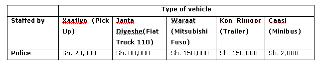 This roadblock, known as Ex-Control, is about 7 km from Mogadishu. It used to belong to a militia loyal to Osman Atto, a former warlord who is currently a Member of Parliament of the Transitional Federal Government. Now the Police manage this roadblock. Ironically, the commander of the Police Force is Abdi Qeybdiid, who is a former warlord and an archenemy of Osman Atto. This roadblock is manned by 20 to 25 policemen equipped with light weapons. There are also Ethiopian troops nearby as the roadblock is situated between two Ethiopian army positions, one in KM6 and the other in the Correctional Division’s former headquarters. The following table shows how much a vehicle is charged every time it passes the roadblock. The exchange rate at the time of writing 1USD (one US Dollar) equals 21,000 Somali Shilling.