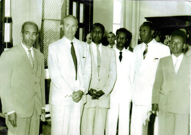 From right to left: Aden Abdulle Osman (then President of interim Parliament), an Italian governor, Abdullahi Iise (then Prime Minister), Sheikh Ali Jimale Barale (Minister for Labour and Social Affairs), Muse Boqor (Minister of Interior), Haji Farah (Minister of Finance).
