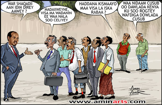 With regard to the charcoal, the expected action of the federal government was to send a delegation to Kismaio, take stock of the charcoal inventory, its value, the identity of the exporters and importers, the tax surcharge, modalities of payments and money transfer and discussion with the local population on the present and future expectations so that it can develop policy options. Armed with that information, the federal government was supposed to engage the UN Security Council for a satisfactory resolution of the matter within the legal framework in place. Unfortunately, the federal government has been deprived of that opportunity after the federal delegation has been turned back from Kismaio airport by the Kenyan forces. The public opinion on the incident has been summarized by Amin Amir’s cartoon (see fig 1).
