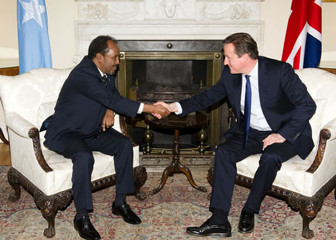 President Mohamud with British PM David Cameron "globetrotting with photo shoots with world leaders as the biggest achievement." - Photo Getty Images