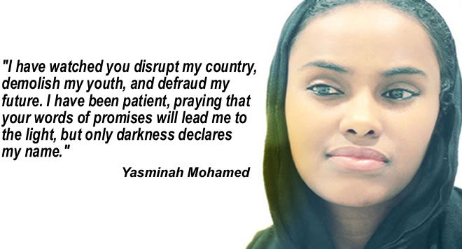 I have watched you disrupt my country, demolish my youth, and defraud my future. I have been patient, praying that your words of promises will lead me to the light, but only darkness declares my name.
