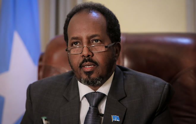 Somali President Hassan Sheik Mohamud is seen in his presidential office inside Villa Somalia