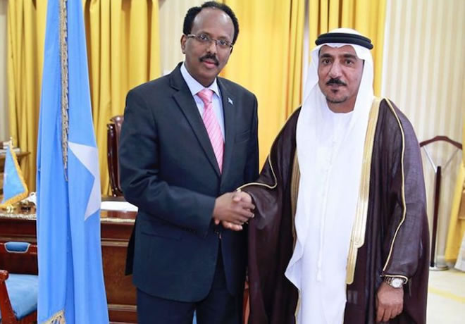 Somali President Mohamed Abdullahi Farmajo with UAE Ambassador to Somalia Mohammed Ahmed Othman Al Hammadi.