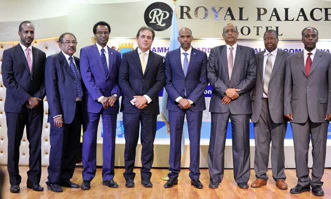 Somalia Prime Minister Khaire pictured in a photo group during the launch of the Somali economic council. Photo courtesy: OPM