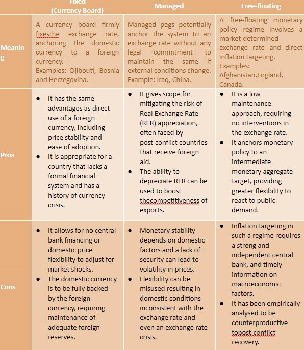 Accordingly, it is important to consider other currency possibilities. If the dollar option is not selected, then a new Somali currency would have to be introduced. From a political point of view, this approach is a no-brainer: the authorities view the new currency as an important ‘symbol of national sovereignty and unity’ of Somalia. Further, it allows the Central Bank to capture the seigniorage profits. But the introduction of a new currency comes with challenges of its own. At the very outset, this approach presents further policy questions in the form of the choice of monetary policy regime to be adopted – fixed (currency board arrangement), managed, or free-floating. The pros and cons of these regimes are discussed in the table below.