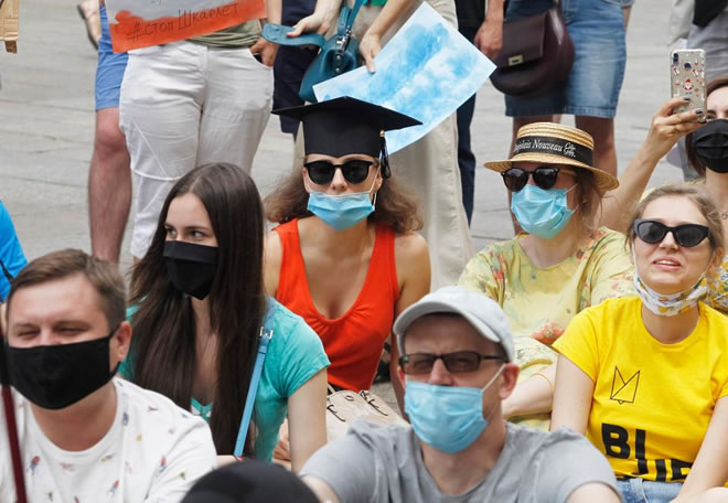 Ukrainian students take part at a rally in Kyiv. NURPHOTO VIA GETTY IMAGES
