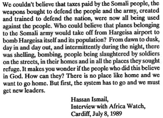 Anyone who has any qualms about what precipitated Somaliland’s reclamation of its sovereignty should read the report by the well-respected Human Rights Organization, Africa Watch, entitled “Somalia: A Government at War with Its Own People; Testimonies About the Killings and Conflict in the North, January 1990”.