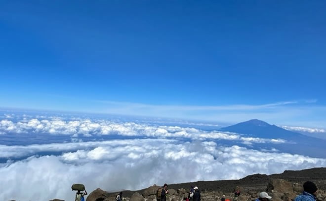 Intayadii kale waxaan Uhuru Peak cagta dhignay 9:45 subaxnimo. Waxay nagu qaadatay ilaa 9 saacadood. Markaan Uhuro Peak gaarney dad badan baa filanwaa la ilmeeyey. Sababtoo ah sahal maaha in dad jirkoodu u bartay socod yari, oo meelkasta ku gaara baabuur iyo gaadiid kale ay fuulimaadkan dhameystiraan. Waxaan arkay haweeney Sacuudi ah oo la socotey koox Khaliijka ka timid oo farxad la ilmaynaysa. Anigu markaan kor cagta dhigay dhinacbaan u dhacay oo daalkii oo dhan baa igu soo baxay.